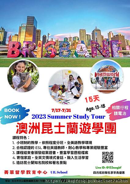 🌟 開創學習之旅,暢遊澳洲布里斯本!🌟🌍 2024的寒暑假,與我們一同探索充滿活力的澳洲布里斯本!不只是一趟遊學,更是一場無限可能的深度體驗!🌟 🏠 家的溫馨:我們為您安排親切的澳洲接待家庭,融入當地文化,讓您在陌生的地方感受溫暖的家的感覺!🏡 🎓 學術交流:與當地學生一同上課,平行插班,1:1學伴制度!每位台灣學生搭配一名澳洲當地學生當School Buddy,融入學校社群,增進英文能力,跨足文化的門檻,開啟未來的國際視野!📚