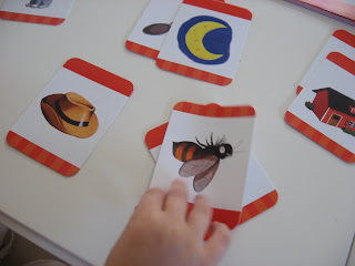 I have to start off by saying when I opened the package I knew there would be flash cards included and had to giggle when my son only wanted to play with them. He’s never seen flash cards and I had a good laugh that I’d be reviewing something that included them on my blog that is devoted to learning with out them. So I am going to address this before I get into the nitty gritty. I don’t think flash cards are inherently evil, I just don’t think they are the best way to learn, they get results but the results are usually pretty shallow, they are memorized not understood and often used in such a static way that children are missing out on learning to the depth that they need, and in a way that they will make true connections, which in my opinion is through play and discovery. This picture is one of my son matching up rhyming words like cat and hat, spoon and moon and tree and bee!